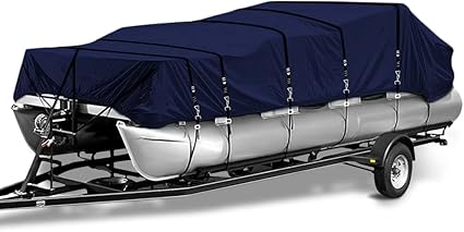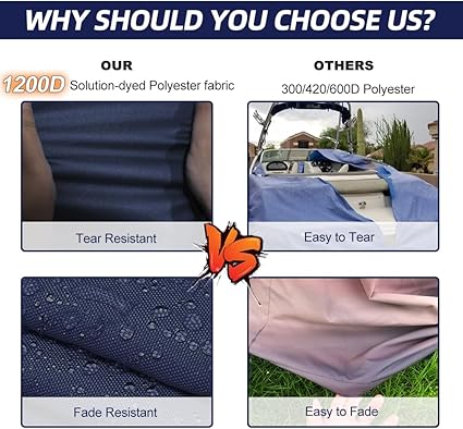 - FADE AND TEAR RESISTANT FABRIC: We use extremely durable marine-grade 1200D Solution-dyed Polyester fabric. Thicker material and double-stitched craft ensure our pontoon cover can work for a long time. Compared with other similar products, in addition to basic waterproofing and UV protection.The most important thing is that it will not fade and tear in the case of long-term high temperature and rain soaking. Maximum protection of your boat from sun, rain, dirt, contaminants, and more.