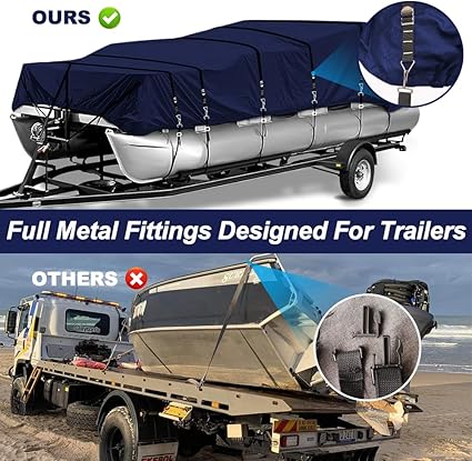 - Real Trailerable patented design:Seapisode boat cover upgrades the traditional trailer design, replacing the flimsy plastic buckle with a strong metal buckle, and the connection between the strap and the cover is reinforced. Effectively prevent the cover from falling off due to the breakage of the buckle and the webbing during high-speed towing, and ensure the safety of the boat when towing. The metal buckle will not touch the hull, so you don't have to worry about scratching the boat.