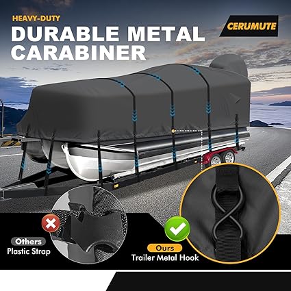 - Metal Buckle Trailer Boat Cover:Pontoon boat cover has 16 pcs adjustable metal buckle straps, securely fastened around the boat, ensuring stability without scratching. Metal buckles offer higher reliability and exceptional durability, especially during high-speed towing. Plastic fasteners are prone to breakage, especially in strong winds. The metal buckle straps effectively prevent the cover from coming off during high-speed towing, ensuring safety.